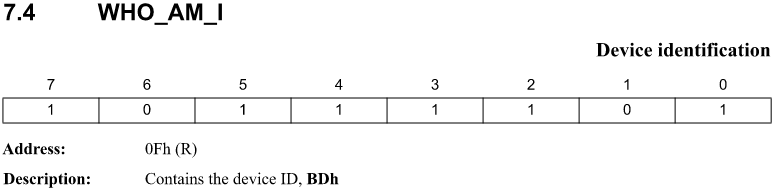 データシートによると、このデバイスは、WHO_AM_Iレジスタ (0x0f)を読み込むと 0xbdが返される仕様なので、これを確認してみます。