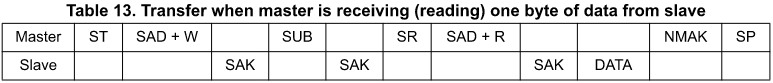 これを見ると、RaspberyPiのI2Cは、このセンサーがデータシートで要求しているI2Cシーケンス(下表 Table13)と少し異なりますが、さいわい意図した動作はするようです。
