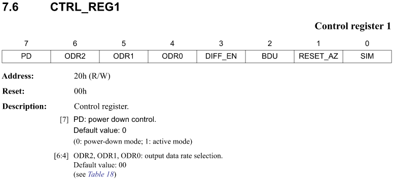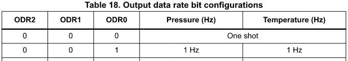次に、気温と気圧を取得することに挑戦します。データシートから最も簡単に使えそうな、1回/秒で自動で計測するモードを試します。これには、CTRL_REG1(0x20)を設定します。併せてアクティブモードにして動作を開始させます。